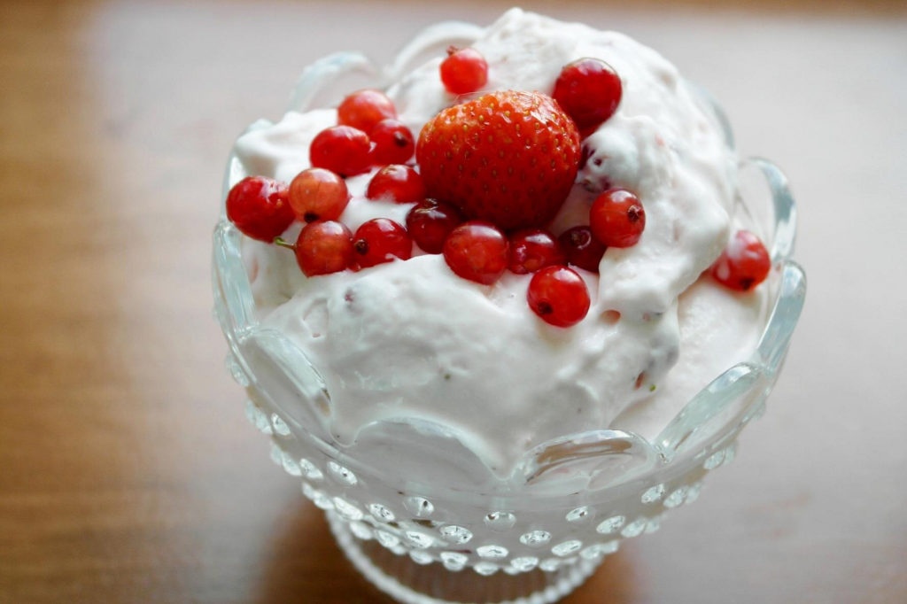 Curd cheese cream topped with strawberry. Photo by Andrew_Writer.
